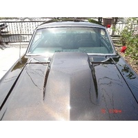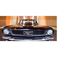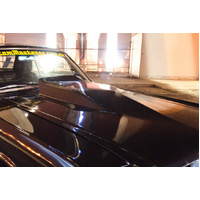 All Fiberglass Construction. Quality Hand Laid Fiberglass Reproduction of 65-66 Mustang Hood with our own custom 3" tall reverse cowl style scoop. Has threaded metal inserts for stock hinges and lock down catch, but additional hood pins are recommended. Locations for the original hood letters (F O R D) are marked out for your convenience if you want to fit them.