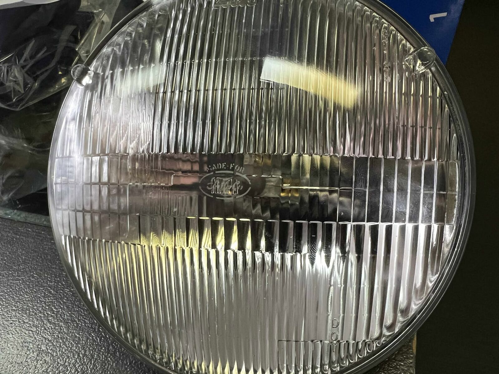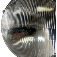 Officially licensed by Ford, Scott Drakes 7" Round Halogen Sealed Beam Headlamps feature nice Ford markings and upgraded performance. Over the years Ford offered two FoMoCo script versions: one sandblasted etched logo, and the other a prominent reverse raised FoMoCo logo about 7/8" wide. This is the etched version. Featuring a dual filament bulb with a 50-watt low beam and a 55-watt high beam. Sold individually
