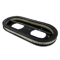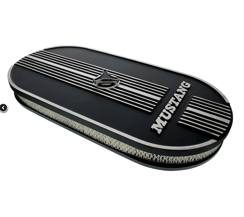 Die-cast aluminum oval air cleaner for dual four barrel carburetors. It features a black coated housing with cast aluminum ribs, outline, and Mustang script.