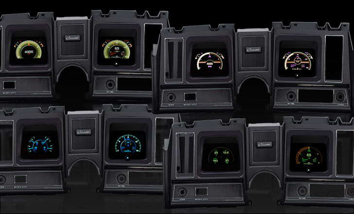 A drop-in upgrade for your stock or reproduction plastic bezel (available separately), this GRFX package will bring the look of currrent technology to the retro iconic Camaro dash. With the key off, the look is all but OEM with a large speedometer and tach, but adding power changes everything. Stock lenses and indicator rings are replaced with matte black aluminum trim rings (supplied).