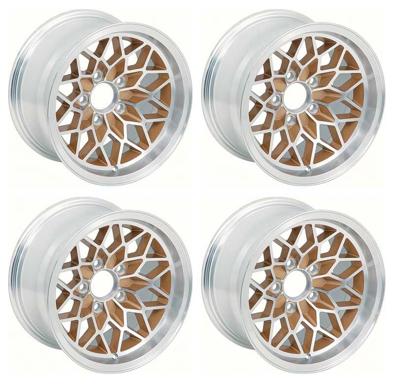 Reproduction of the original cast aluminum "Snowflake" wheels designed for use with 1978-81 Pontiac Firebird and Trans Am models. This wheel set was originally part of the WS6 option package on 1978-81 Trans Am models. Each set has gold painted inserts and is finished with a clear coat as original. Features  4-1/4" backspacing and 5 x 4-3/4" bolt pattern. Wheel weight is 24 lbs each.