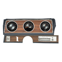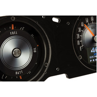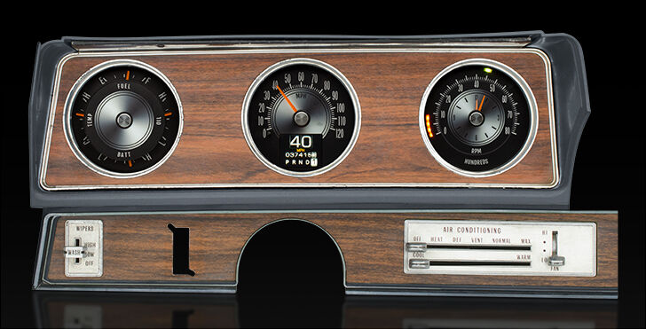 The trio of round gauges give the ’70-72 Cutlass interior a traditional look, but doesn’t necessarily lend itself to aftermarket upgrades. This is entirely solved with the introduction of the RTX-70O-CUT application, placing a quad-pack of auxiliary gauges on the left side, an OEM looking speedometer and programmable message display in the center, along with a clock and LED bar-graph tachometer in the right-side location. Integrated OEM styling retains that familiar Oldsmobile look, but provides the 21st century upgrades that you expect from Dakota Digital.