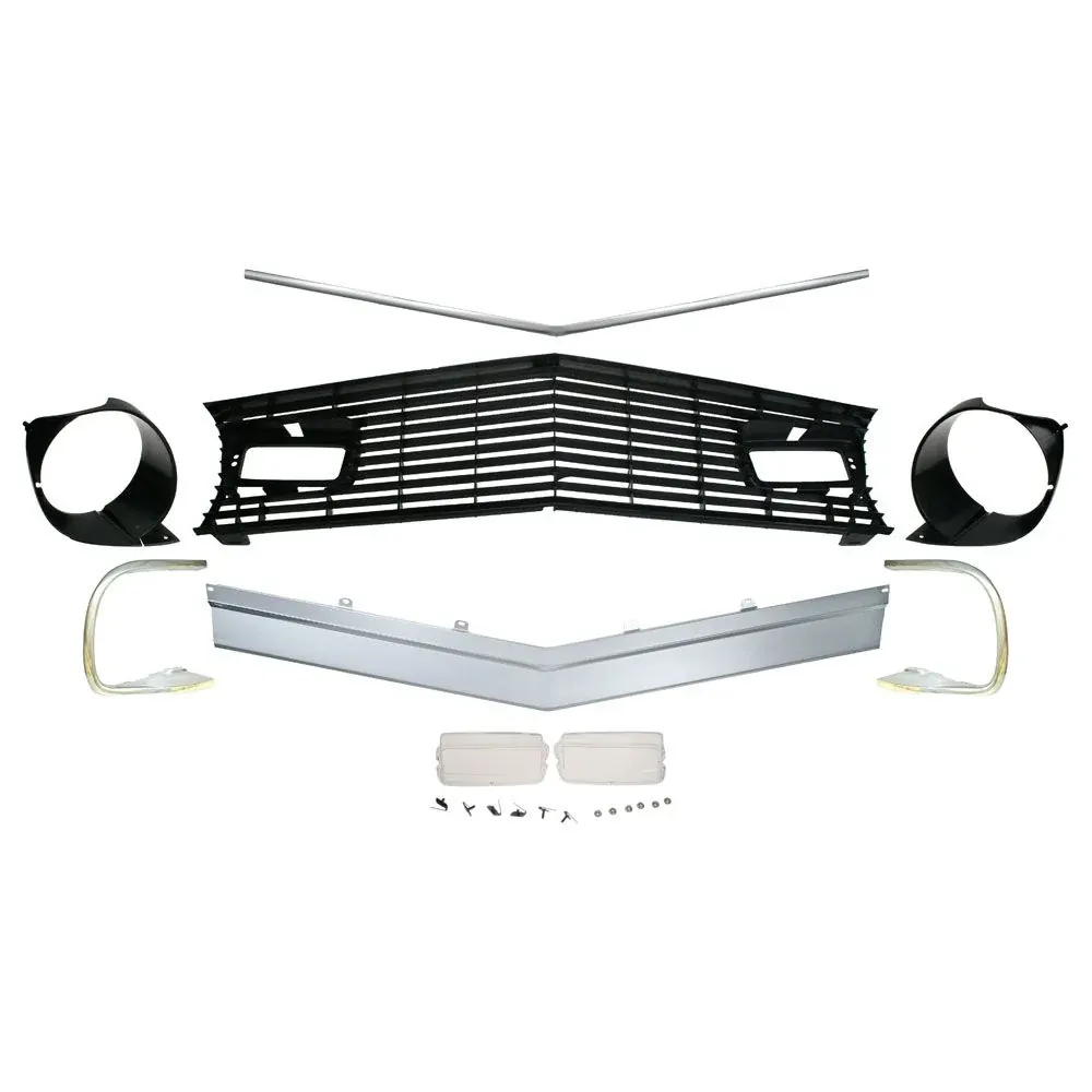 Molded of the correct black plastic for a proper finish and includes opening for the sport lamps. Includes the Mach 1 sport lamp Lenses, Headlight Bezels, Hood Molding and 3 Grille Moldings.