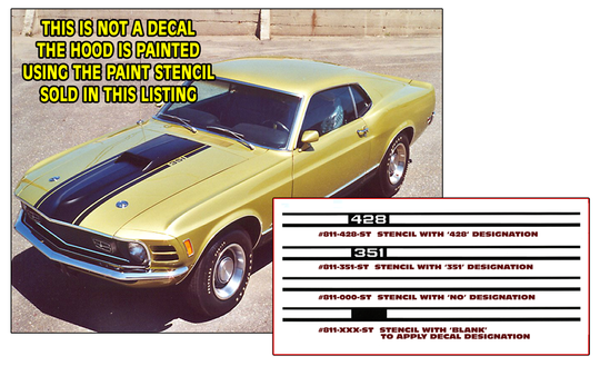 1970 Mustang Mach 1 Dearborn Hood Paint Stencil - STRAIGHT STRIPE KIT - Dearborn built NON RAM AIR hood scoop. Used to paint entire center of hood and stripes. Stencil available in styles 351, 428, blank for decal placement or full stripes no designation used.