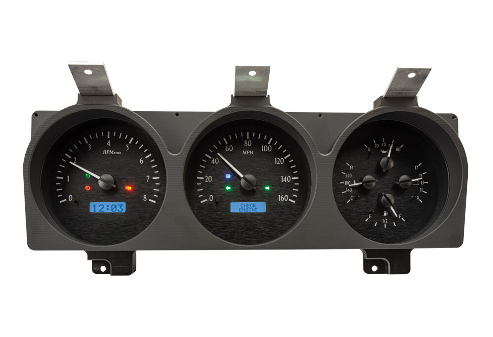 Upgrade your 1981-93 Full Size Truck or Ramcharger with this direct-fit instrument system! Six analog readouts bolt within the three OEM gauge opening, featuring a pair of LCD message centers, LED Lighting and nearly unlimited expansion ability. This system reuses your existing front bezel for a seamless upgrade. Compatible with stock drivetrains or an updated conversion, the speedometer can be used in mechanical applications or with a pre-existing VSS.