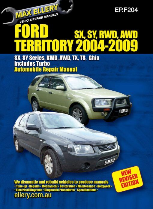 The complete Territory range is covered in great detail and feature six cylinder and turbo charged engines. Factory specifications, wiring diagrams, diagnostic charts, tune-up information, detailed and easy to follow diagrams