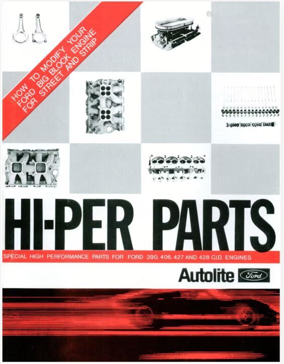 This 38 page paperback booklet covering big block modification for power and performance. Also has a listing of Autolite-Ford Hi-Per parts available through Ford and Lincoln-Mercury dealers.