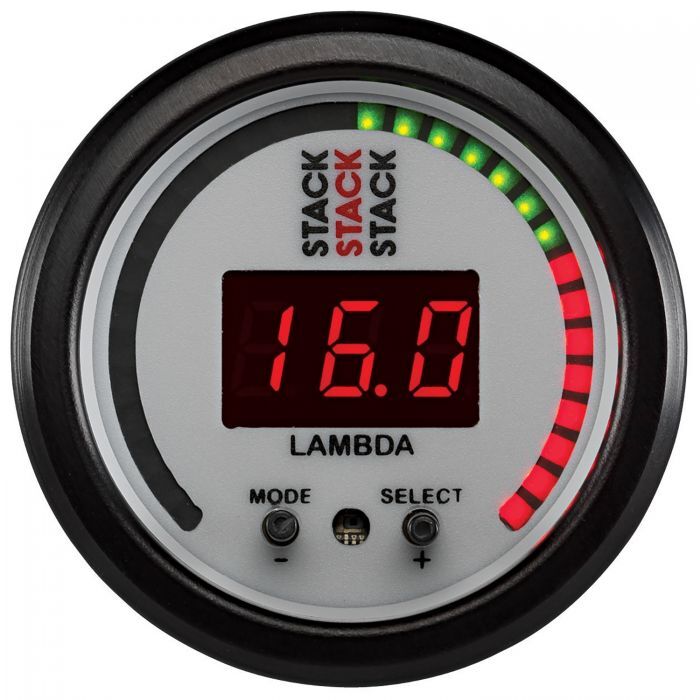 STACK Wideband Air-Fuel Ratio (Lambda) gauges are the ultimate tuning aid! Dimmable dual digital red numeric and multi-colour radial LED displays provide accurate real-time readout of either air/fuel ratio or lambda (user-selectable) in a format that is optimised for driver viewing. User adjustable scaling allows for tailored calibration for specialty fuel types and maximum display resolution per application. Inbuilt peak lean value recall and user programmable alarm setting enable quick data review and driver alerts. Inboard photo sensor provides automatic display intensity adjustment for varying ambient lighting conditions (manual driver control may be enabled via switch connection to the illumination wire on the loom). 0-5Volt analogue and serial data outputs may be connected to a data-logger, ECU or other device to provide real-time closed-loop feedback for improved mapping. Pro-Control output allows automatic control of other power systems based on specific Lambda conditions. Supplied complete with wiring harness and includes Bosch LSU4.9 sensor.