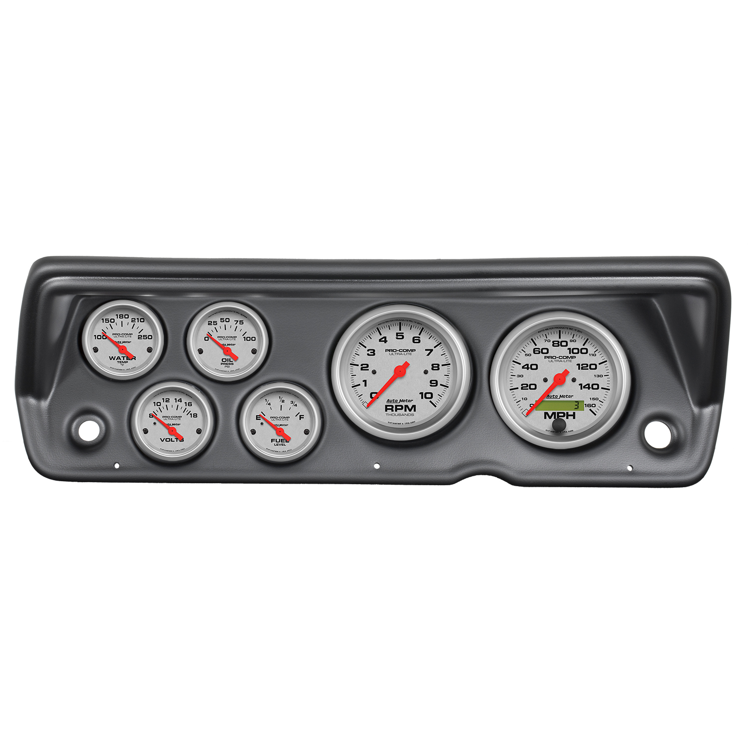 • Includes 3-3/8" Ultra Lite electric speedometer & tachometer and 2-1/16" electric fuel level (73/10 ohm, non-linear), water temperature, oil pressure, and voltmeter