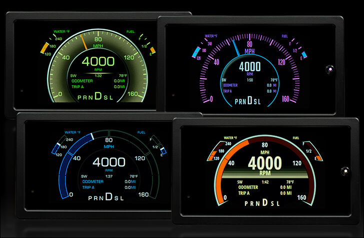 The Grafix Series allows the user to customize nearly every aspect of the instrument system. A variety of graphic themes can be selected, each element within can be further personalized with unique display colors and warning modes. Furthermore, each gauge location can be configured with an Analog, Digital, or Bar-graph style of readout. Each display can show readings singly, grouped in pairs for twice the visible data, or completely reconfigured to show a different readout entirely!