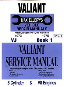 This manual is an authorised factory reprint, for Valiant Chrysler 1973-1975 model VJ. Book 1 covers General Information / Lubrication and Maintenance / Front suspension / Rear axle / Brakes / Clutch / Cooling / Electrical / Engine / Engine oiling / Exhaust system.