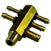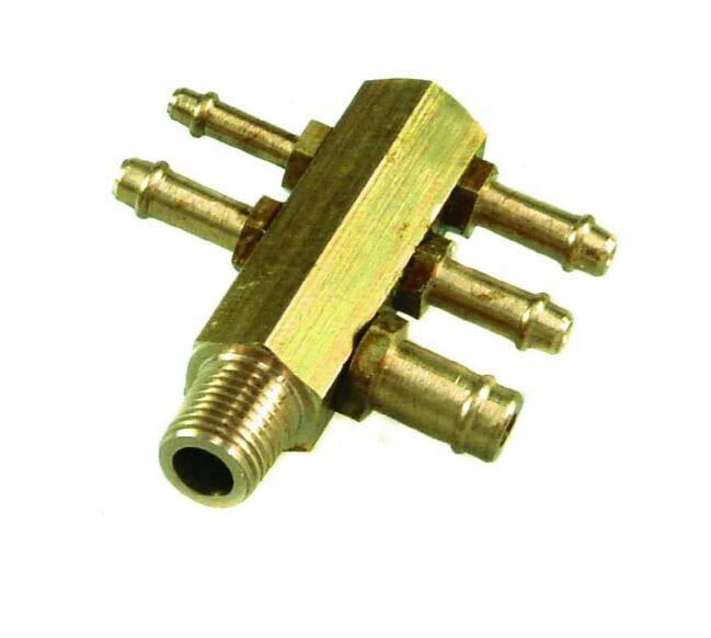 Brass replacement vacuum hose tree to suit Commodore's. This tree has a 1/4" BSP Thread 3 x 1/4" barbs, 1 x 3/8" barb and 1 x 3/16" barb hose fitting.