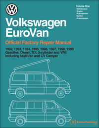 This professional format has been designed to make finding applicable specifications quick and easy, which is especially helpful for trained mechanics who demand quick access to repair information without reading through a lot of text. VW/Audi has won several design awards for this kind of manual design. Engines covered in this Volkswagen repair manual 2. 8 Liter VR6 gasoline (engine code AES) 2. 5 Liter 5-cylinder gasoline(engine code AAF, ACU) 2. 4 Liter diesel (engine code AAB)Transmissions covered in this Volkswagen repair manual 02B and 02G 5-speed manual transmissions 098 and 01P 4-speed automatic transmissions The two volumes of this Volkswagen Official Factory Repair Manual present the service and repair information for Volkswagen EuroVan, EuroVan MultiVan (including Weekender), and EuroVan CV Camper (commonly known as Westfalia camper) models sold in the USA and Canada. For the professional automotive technician, this manual includes the specifications and procedures that were available in an authorized Volkswagen dealer service department as this manual went to press, including: